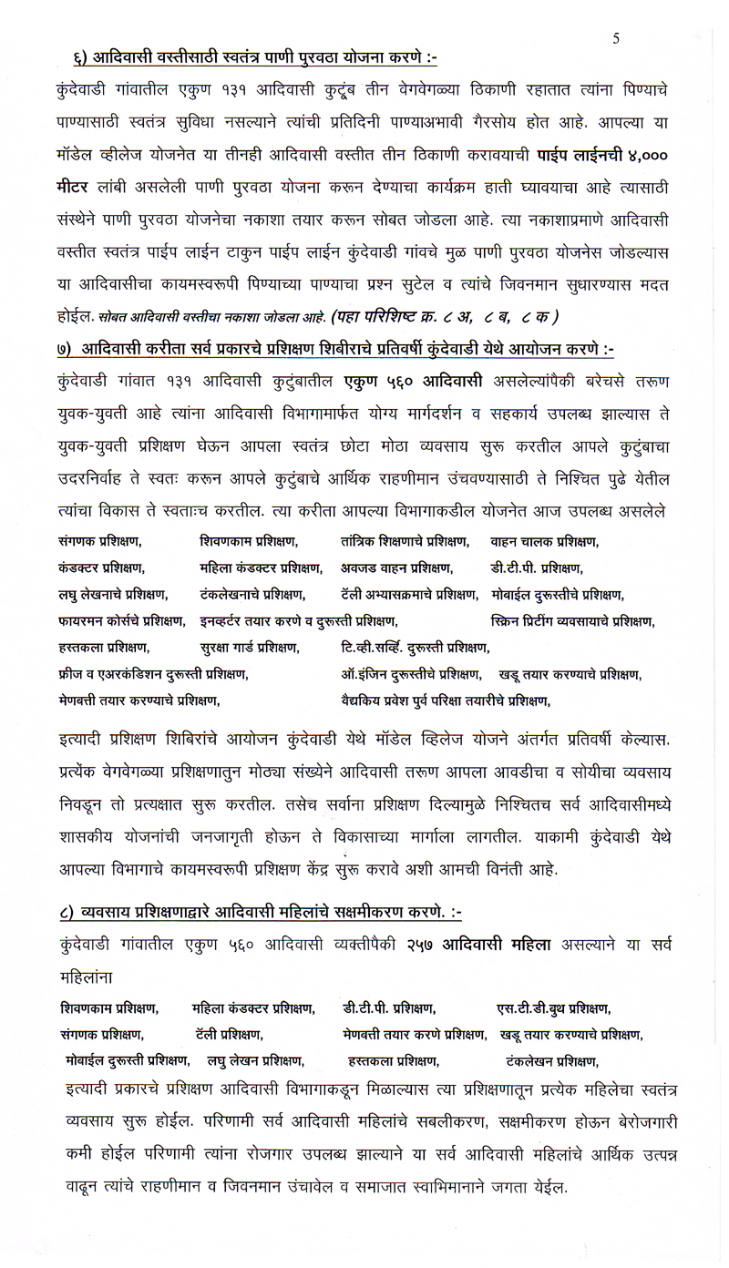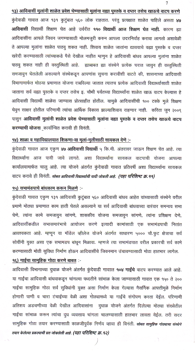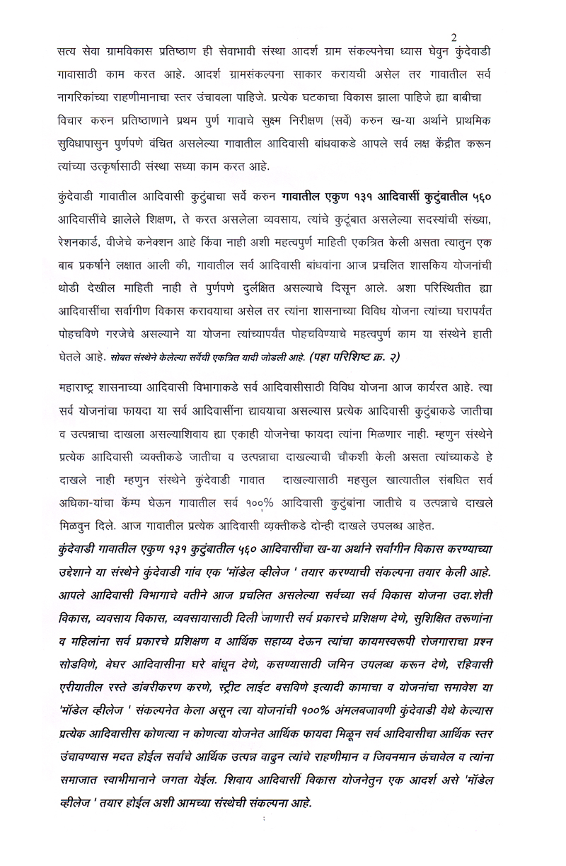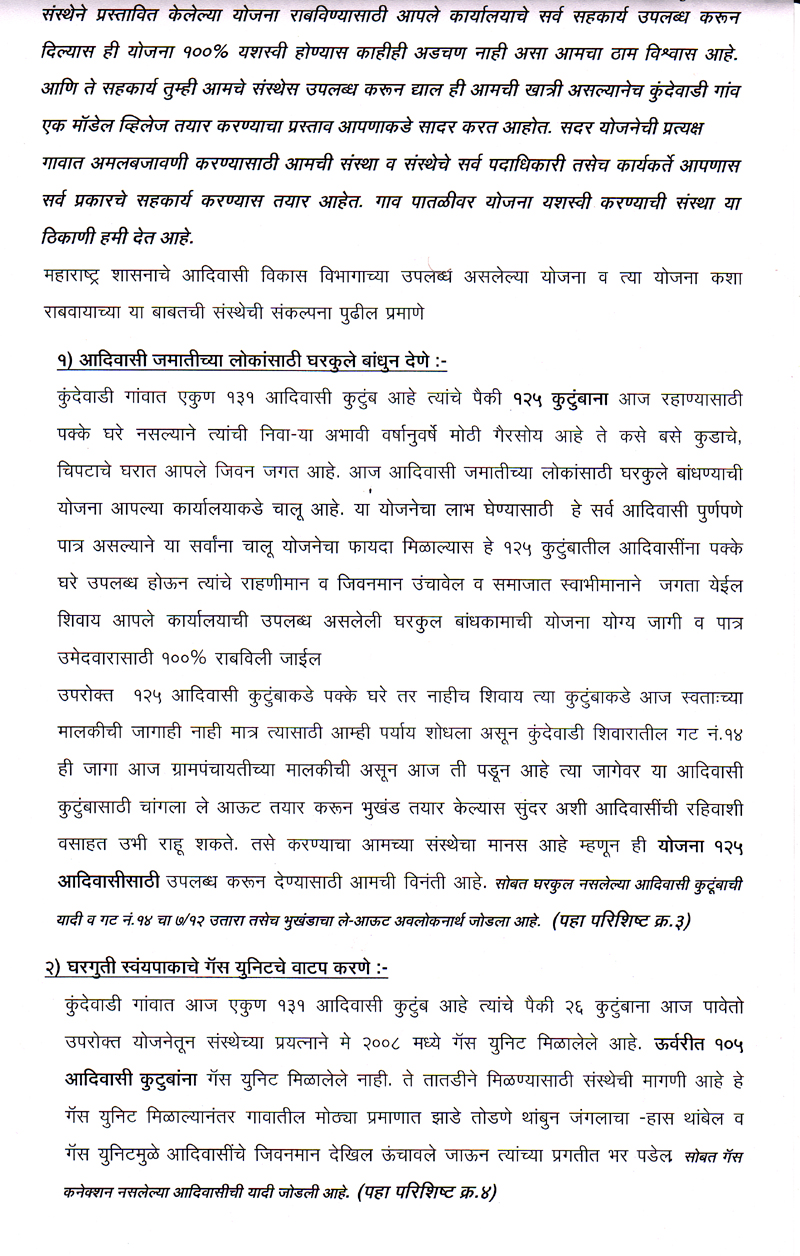 परंतु ही योजना राज्यातील बहुसंख्य आदिवासी बांधवापर्यत पोह्चत नाही परिणामी तिचा फायदा साधारण ९० टक्ये कुटुंबाना मिळत नाही. मात्र आमचा ह्या संस्थेने आदिवासी साठी असलेल्या सर्व योजनांचा अभ्यास करुन ही योजना कुंदेवाडी गावातील प्रत्येक आदिवासी कुटुंबापर्यत १०० टक्के परिणाम कारकरित्या पोहचविण्याचा चंग बांधुन ते काम हाती घेऊन पुर्णत्वाच्या दिशेने संस्थेची वाटचाल चालु आहे.