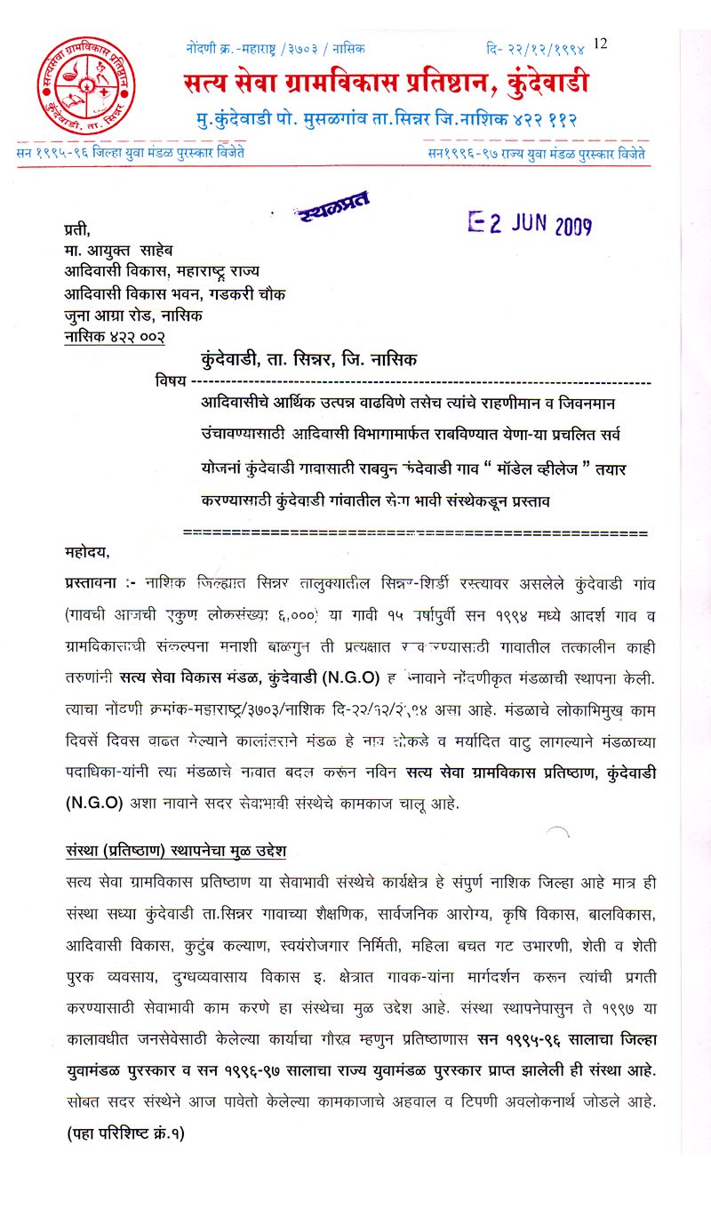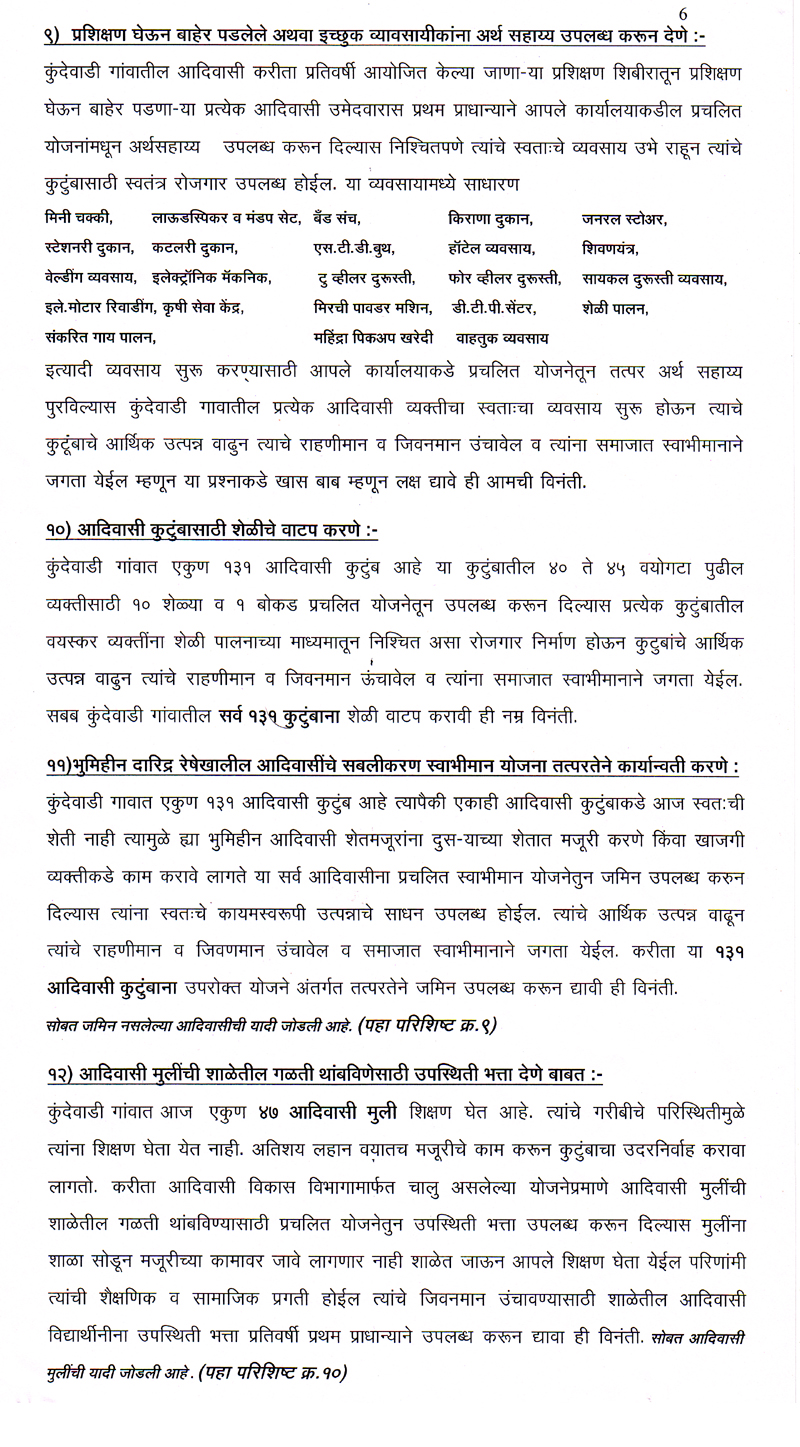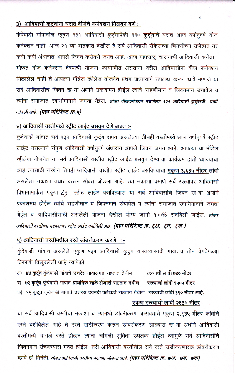 परंतु ही योजना राज्यातील बहुसंख्य आदिवासी बांधवापर्यत पोह्चत नाही परिणामी तिचा फायदा साधारण ९० टक्ये कुटुंबाना मिळत नाही. मात्र आमचा ह्या संस्थेने आदिवासी साठी असलेल्या सर्व योजनांचा अभ्यास करुन ही योजना कुंदेवाडी गावातील प्रत्येक आदिवासी कुटुंबापर्यत १०० टक्के परिणाम कारकरित्या पोहचविण्याचा चंग बांधुन ते काम हाती घेऊन पुर्णत्वाच्या दिशेने संस्थेची वाटचाल चालु आहे.
