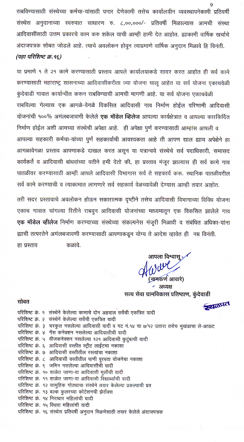 या योजनेचा फायदा प्रत्येक आदिवासी कुटुंबास मिळण्यासाठी करावयाची कागदपत्राची पुर्तता १) विहित नमुन्यात अर्ज २) रहिवाशी दाखला, ३) शाळा सोडल्याचा दाखला, ४) कुटुंबाचा दारिद्रय रेषेखालील नंबर, ५) उत्पन्न दाखला, ७) रेशन कार्डची झेरॉक्स प्रत इ. सर्व कागदपत्रांची देखील पुर्तता संस्थेने केली त्याकामी कोणत्याही व्यक्त्तीस कार्यालयात जावे लागले नाही. त्या मिळालेल्या फायद्याचा तपशिल खालील प्रमाणे-